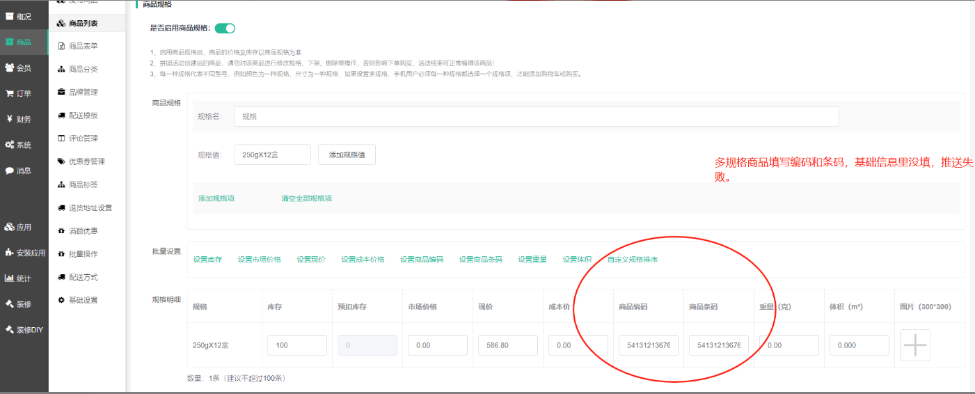 多规格商品,基本信息处的商品编码条码需要填写外,同时规格里面的商品编码、商品条码也需要填写,两者缺一不可,如果只是填写其中一项,会导致推送不全从而导致后续的异常