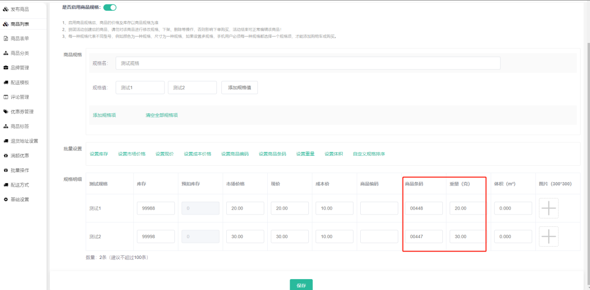 多规格商品设置