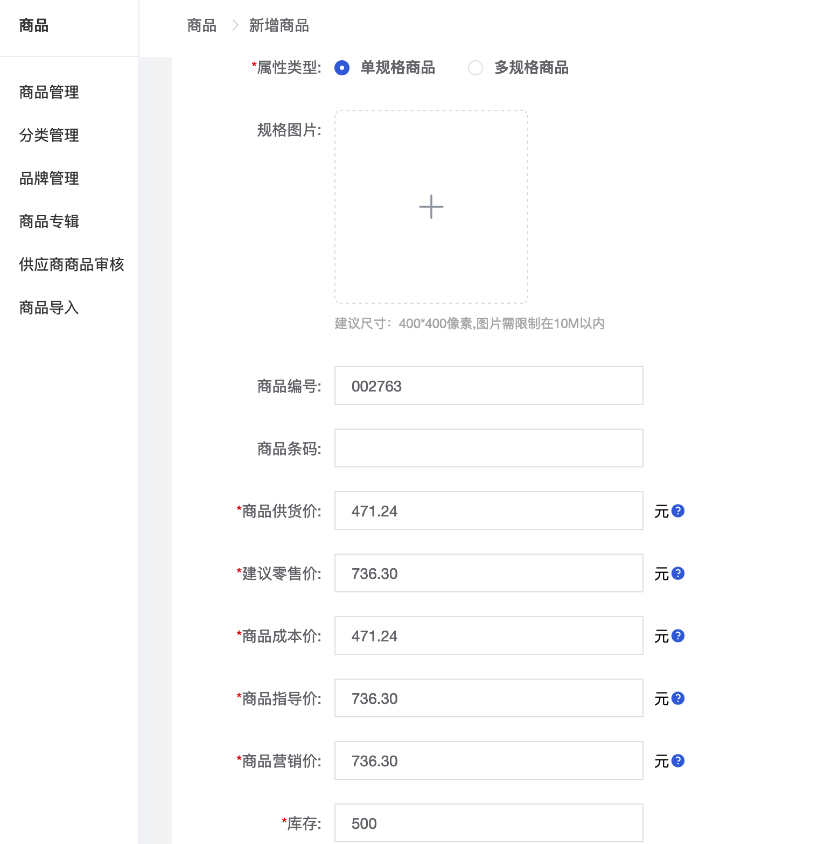 • 属性类型:单规格商品、多规格商品。多规格商品可以理解为一个商品、多个SKU,如不同的颜色、尺寸等。