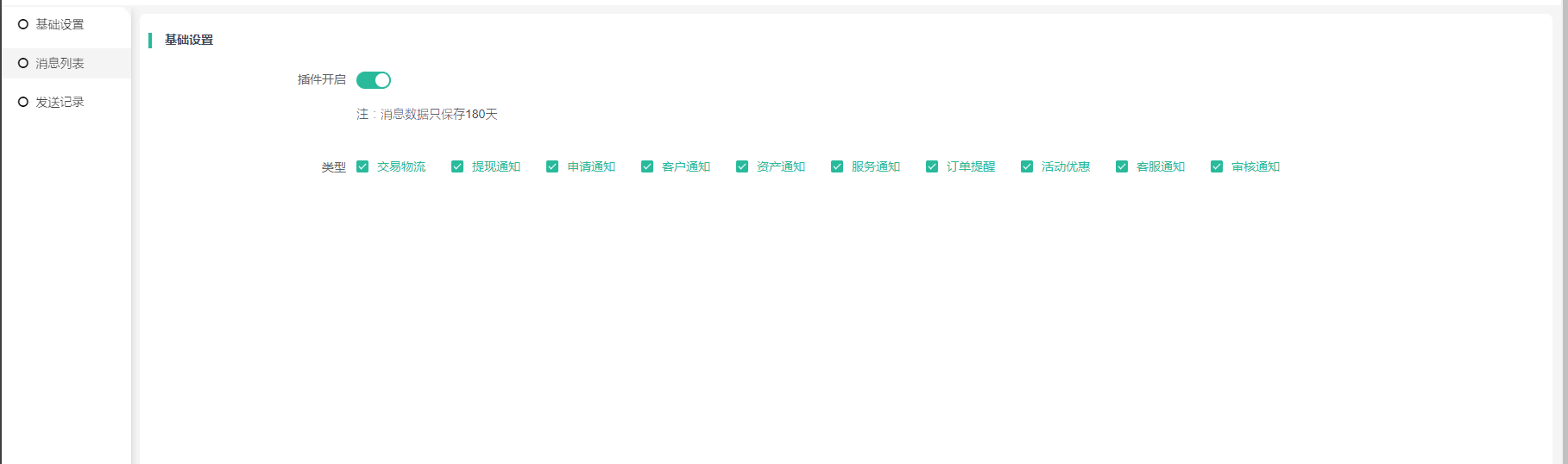 后台插件支持启用站内消息功能并设置指定消息发送通知,未勾选的则不发送通知。如下图