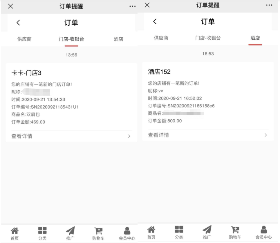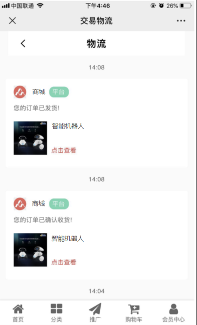 用户在前端会员中心--消息栏目中可以查看交易物流、提现通知、申请通知、客户通知、资产通知、服务通知、订单提醒、客服通知、后台推送的活动优惠等信息。