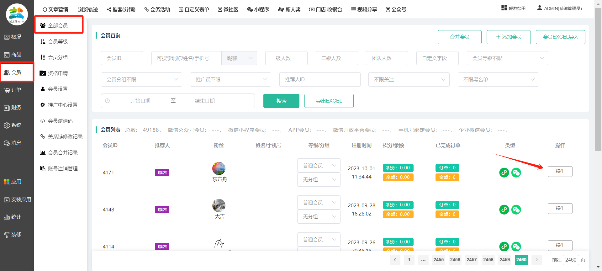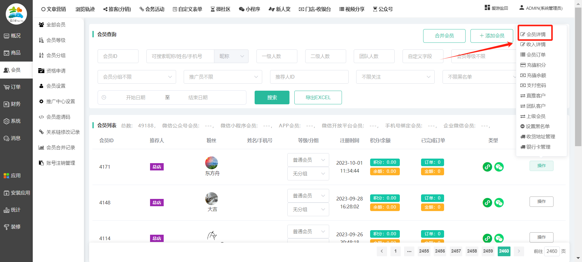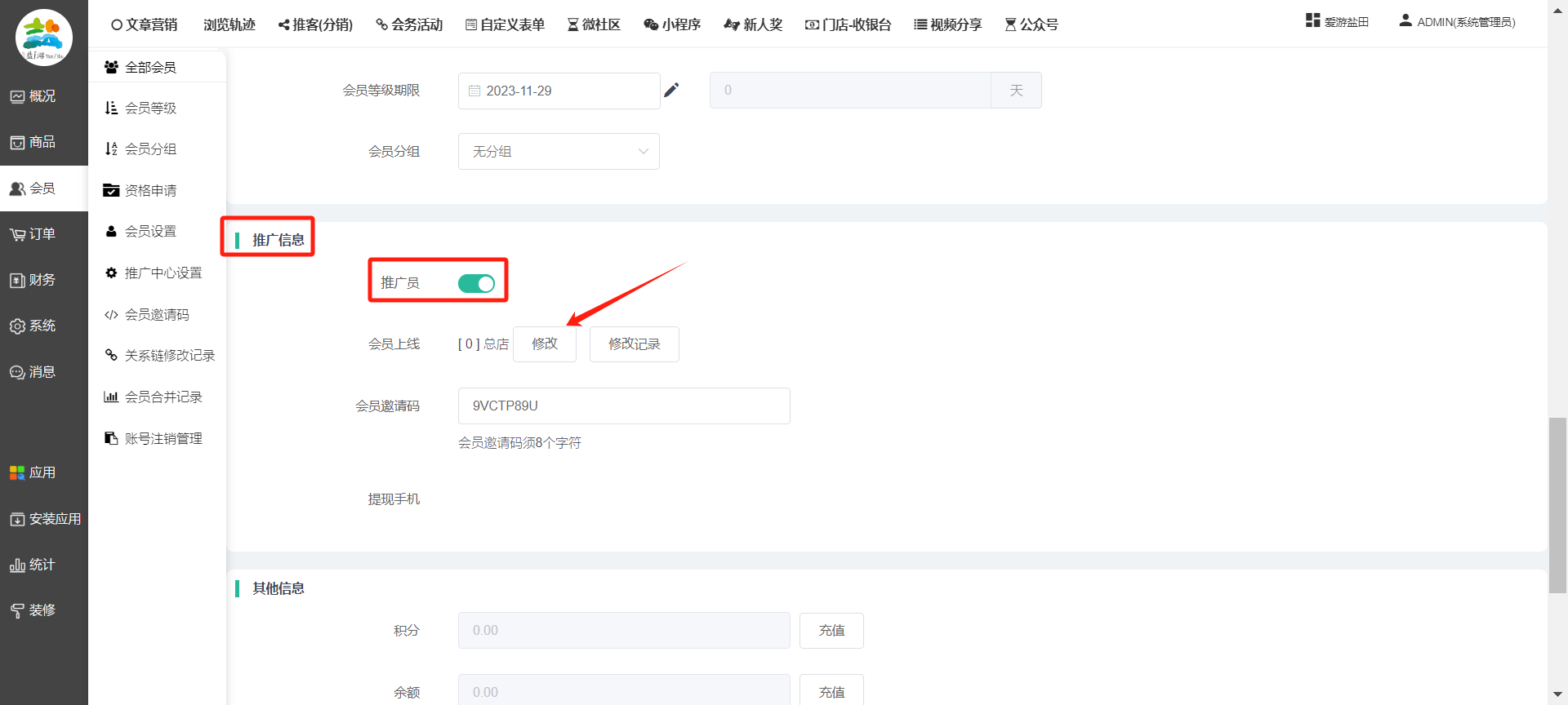 目录 搜索 展开 一、前期准备资料二、数字乡村码-上线操作指南1、服务号的申请流程及认证2、申请小程序流程3、开放平台绑定小程序和公众号三、数字乡村码-系统操作数字乡村码系统管理-概况数字乡村码-商品管理1、发布商品2、商品列表3、商品表单4、商品分类5、品牌管理6、配送模板7、评论管理8、优惠券管理9、商品标签10、退货地址设置11、满额优惠12、批量操作13、配送方式14、基础设置15、商品隐藏四、数字乡村码-会员管理1、全部会员2、会员等级3、会员分组4、资格申请5、会员设置6、推广中心设置7、会员邀请码8、会员关系链修改关系链修改记录9、会员合并记录10、账号注销管理11、会员设置中心五、数字乡村码-订单管理1、订单管理列表2、订单处理流程3、订单状态4、订单修改价格5、订单退款退货6、多包裹发货7、批量发货订单操作步骤8、催发货订单9、物流查询六、数字乡村码-财务管理1、余额设置2、会员余额3、充值记录4、转让记录5、余额明细6、收入明细7、提现设置8、提现统计9、积分管理10、转账审核11、收益广告12、批量充值七、数字乡村码-系统管理1、商城入口2、商城设置①、商城设置②、订单设置③、物流查询④、短信⑤、联系方式⑥、分类⑦、优惠券⑧、分享⑨、幻灯片⑩、广告位⑫、地图设置3、交易设置4、微信模板消息自定义消息模板(新版)自定义消息模板(旧版)小程序消息模板公众号模板消息变更公告5、语言设置6、权限管理7、多媒体管理八、数字乡村码-消息管理九、数字乡村码-应用管理十、数字乡村码系统-数据统计十一、数字乡村码-页面装修DIY1、模板管理2、店铺页面3、顶部导航4、底部导航5、DIY模板市场6、首屏广告7、基础设置8、装修DIY尺寸建议十二、供应商功能插件操作指南1、供应商2、门店-收银台门店申请和使用步骤门店管理①、门店-收银台 营销设置②、门店-收银台 分润设置门店分类门店申请门店审核门店商品门店商品订单收银台订单数据统计核销员基础设置默认设置门店装修3、微社区4、会务活动十三、营销插件操作指南活动报名提货卡新人奖微店问卷调查积分视频分享1、视频分享基础设置2、视频分享发现管理3、视频分享分类管理4、视频分享评论管理5、视频分享分红记录6、视频分享短视频中心每日红包幸运大抽奖签到优惠券二维码任务奖励优惠劵文章音频文章付费文章限时购新海报拓客卡操作流程积分活动素材中心视频红包十四、入驻门店应用类1、门店预约2、附近商品3、门店定位设置4、门店控制5、门店满额包邮6、门店满额减7、导入商品8、门店搜索9、门店股东10、核销券11、多门店核销1、商城后台设置2、前端功能演示十五、常见问题1、后台登录密码修改流程2、会员-余额,积分,后台如何进行充值与扣除3、如何修改上下级关系4、一种万能的获取商城小程序路径的方法 暂无相关搜索结果! 阅读次数:1695 本文档使用 模王系统 发布 8、会员关系链修改 8、会员关系链修改一.如何修改上下级关系?1.会员-全部会员-可以通过搜索用户的独立ID,或者用户微信昵称,找到此会员,然后点击右边的(操作)2.再点击会员详情。3.滑到下面,有个推广信息-会员上线,点击修改4.输入上级的ID号,点击搜索,出来此上级会员后点击选择。5.滑到最下面,一定要点击提交按钮。文档更新时间: 2023-11-30 14:56 作者:链上旅行