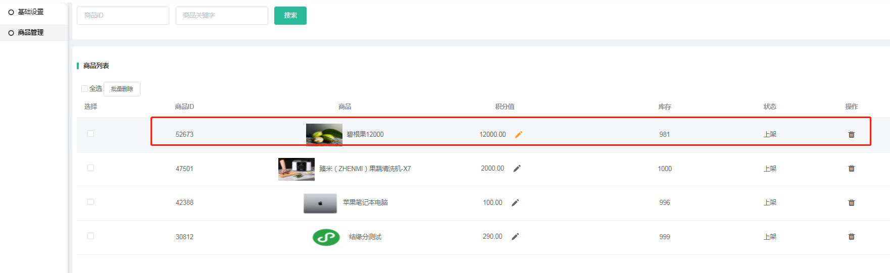 2:商品管理-点增加商品-输入积分全额抵扣商品名称-搜索-选择-提交-
