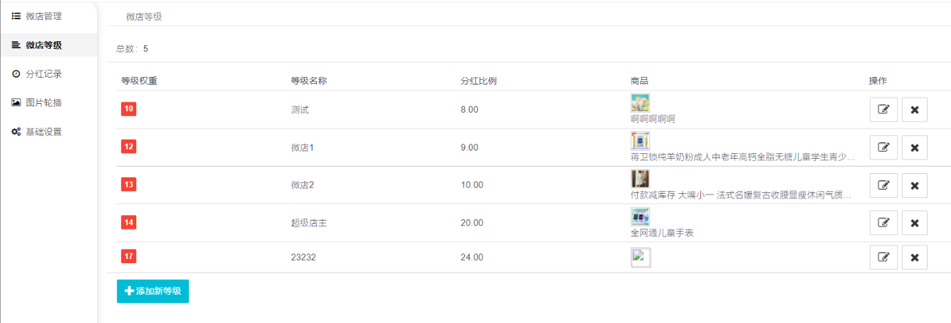 分红比例:该等级店主默认获得的商品分红比例,商品中支持设置独立的分红比例,商品独立分红比例计算级别优先于等级默认比例。